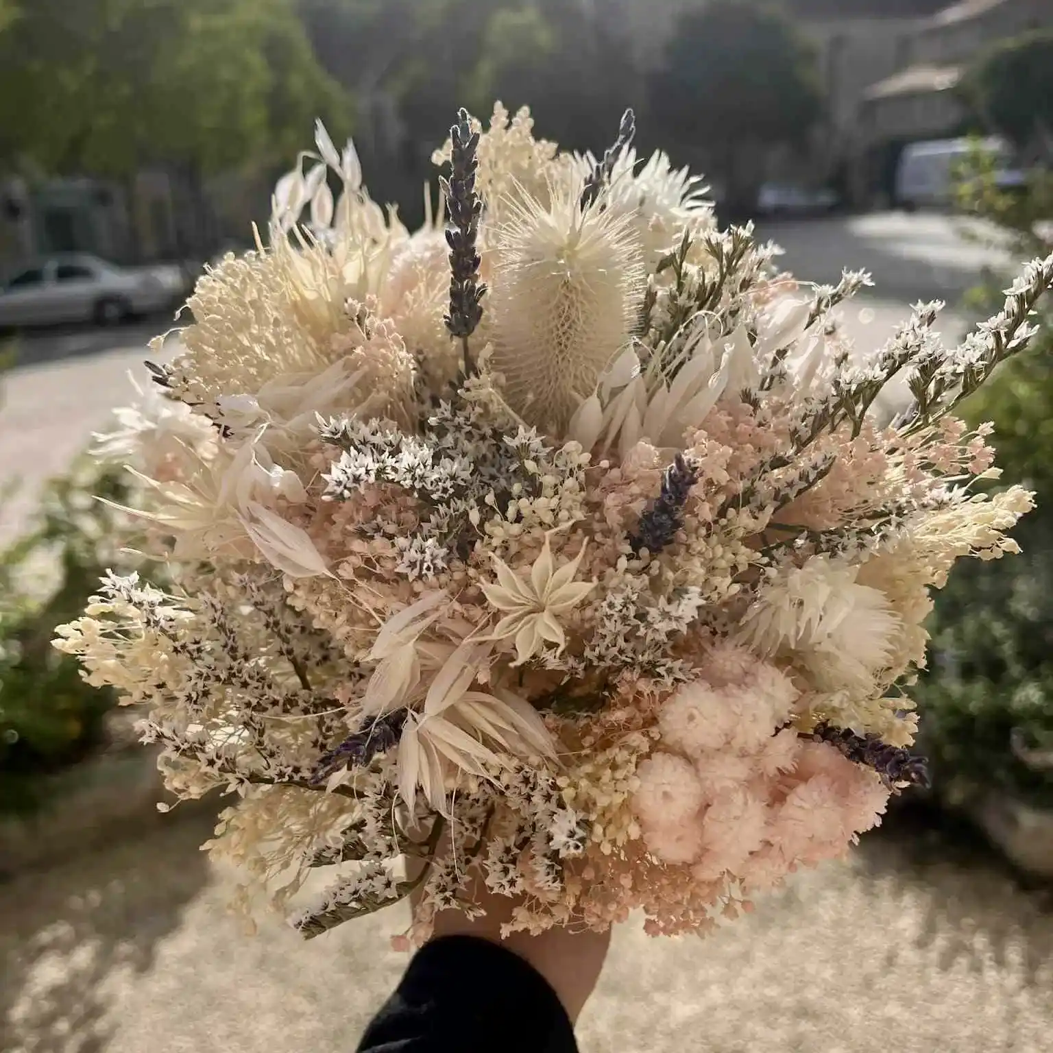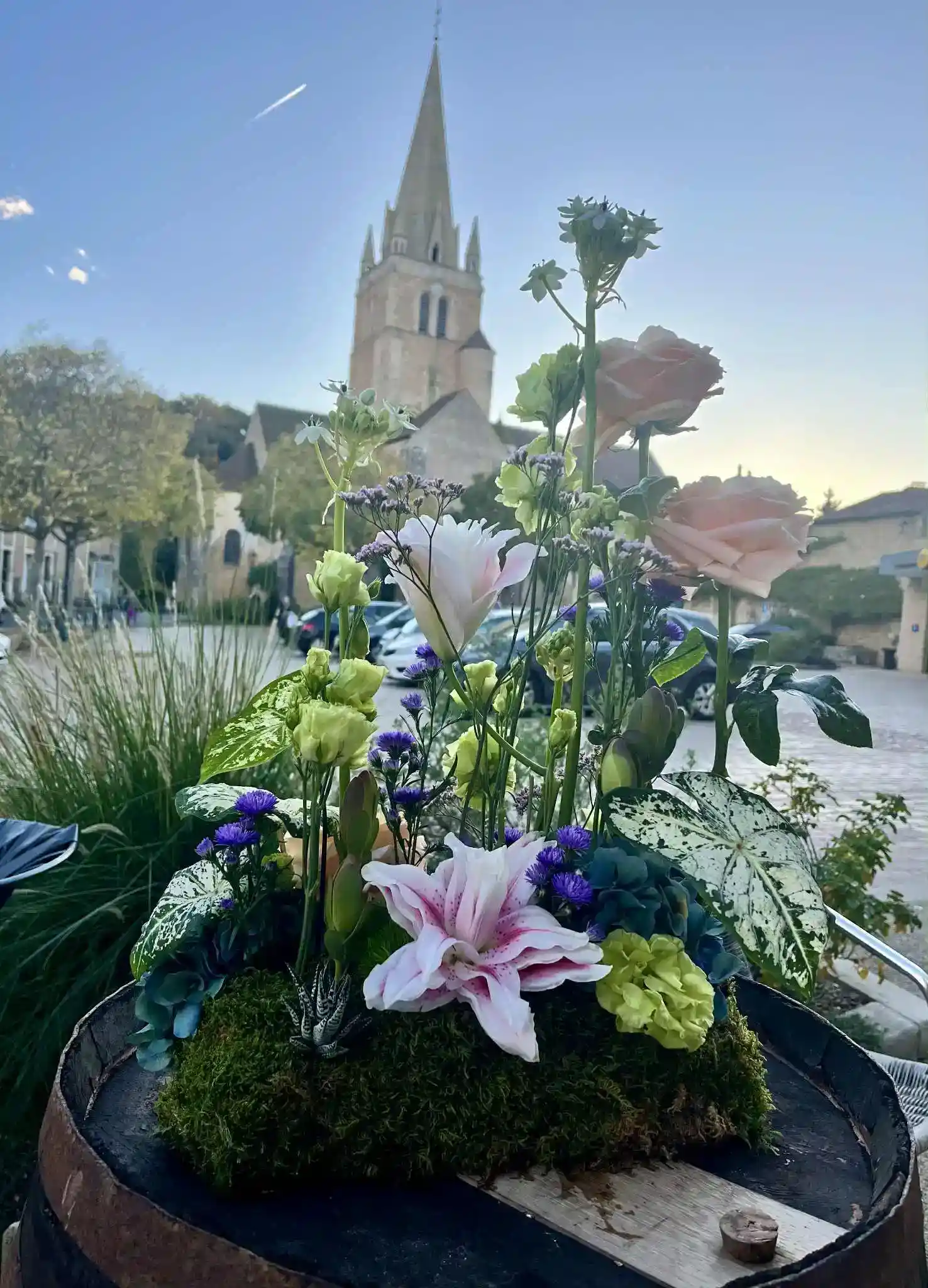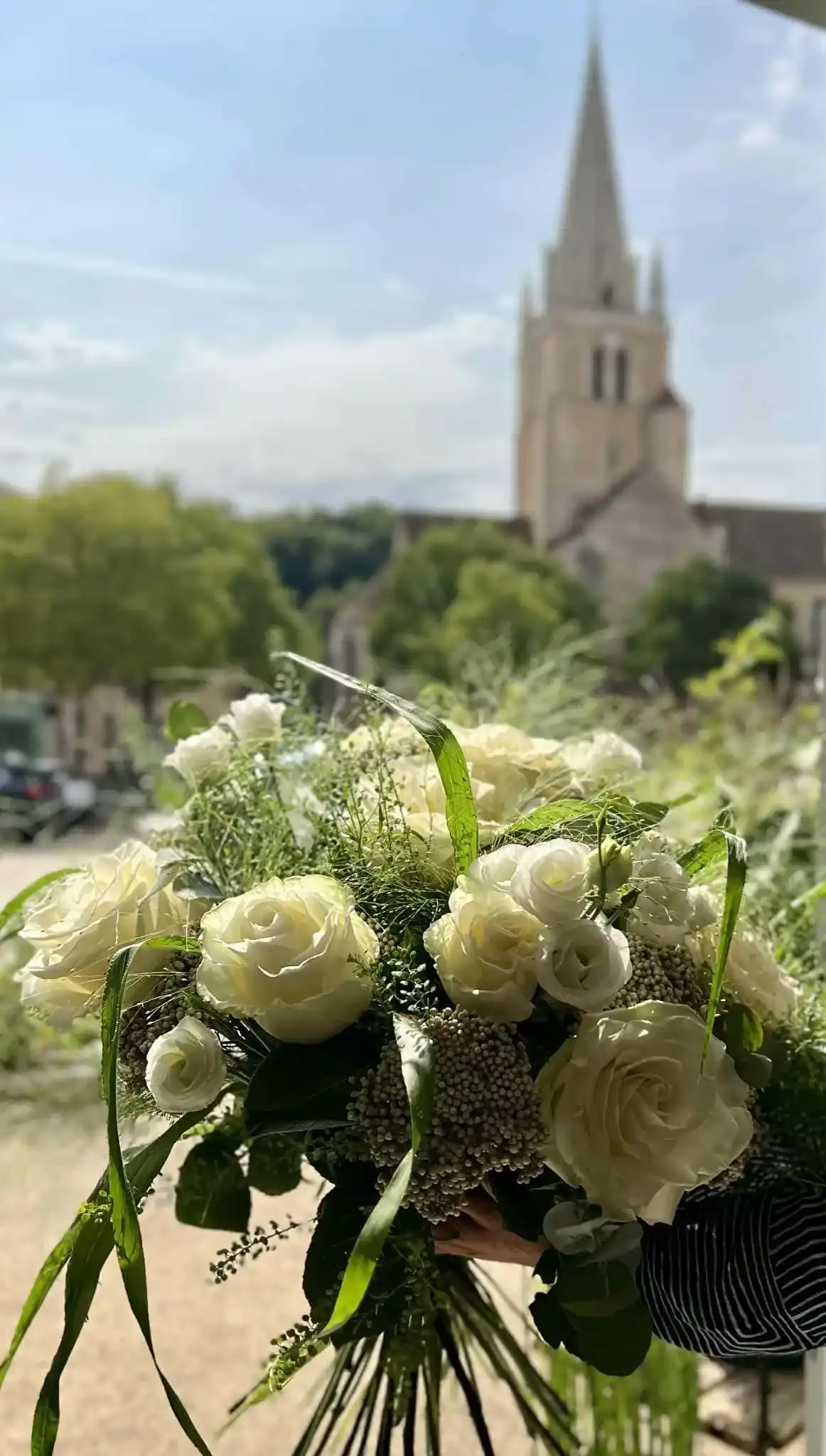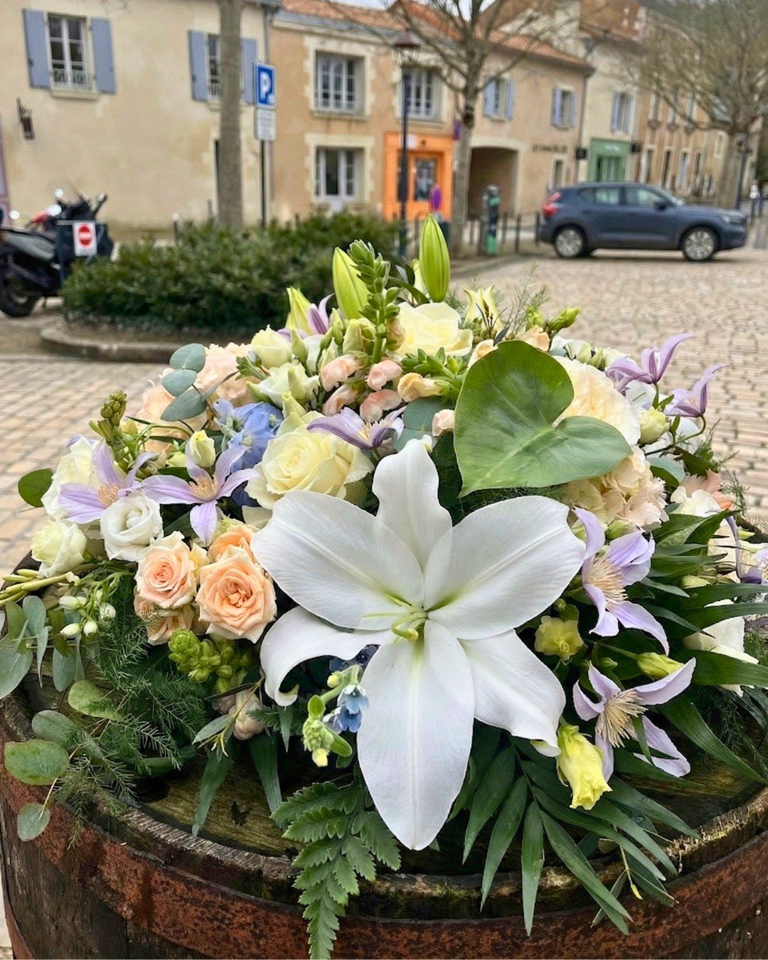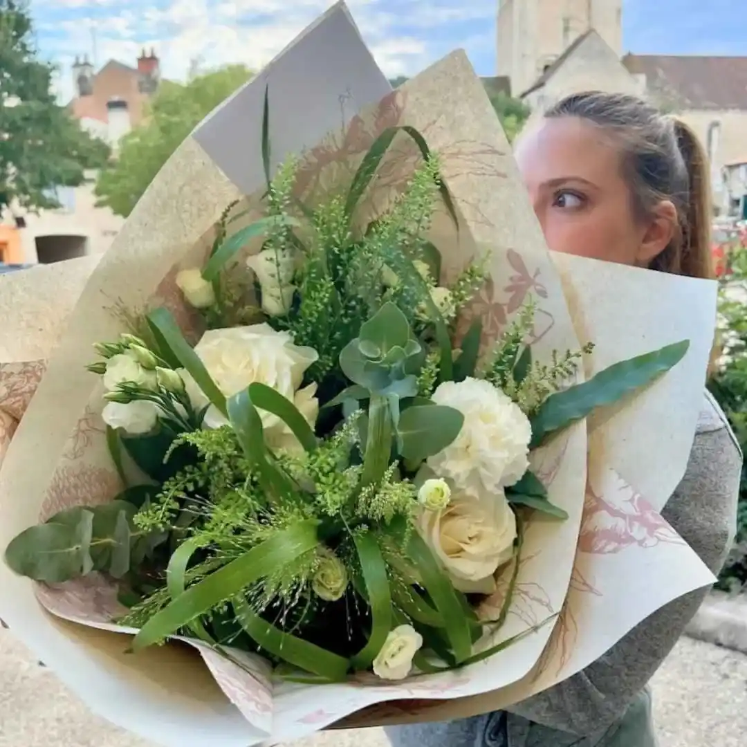 Côté style, je crée aussi bien des beaux bouquets classiques — comme le bouquet rond intemporel, le bouquet de lys élégant, ou des roses blanches pures — que des bouquets personnalisés plus libres, champêtres, avec amarylis, eucalyptus ou fleurs poitiers du moment.